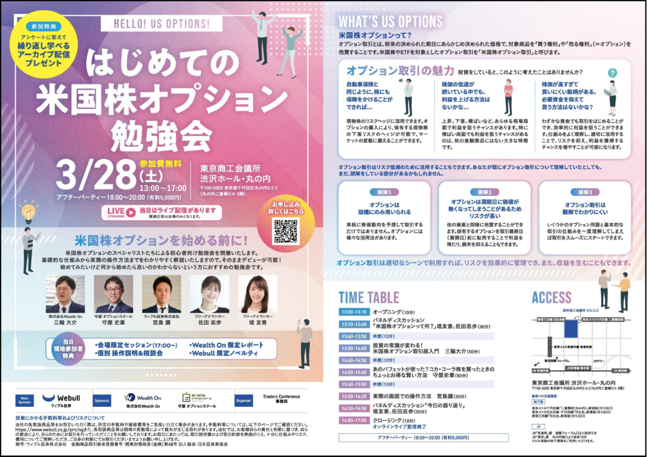 特典: 当日現地でご参加いただいた方には以下の特典があります。 ・会場限定セッション(17:00~) ・個別 操作説明&相談会 ・Wealth On 限定レポート ・Webull 限定ノベルティ ・イベント当日のアンケート回答者にアーカイブ配信を提供 ※本特典のみライブ配信をご視聴の方も対象です。 タイムテーブル: 13:00–13:10|オープニング(10分) 13:10–13:40|パネルディスカッション「米国株オプションって何?」 堤友香、佐田志歩(30分) 13:40–13:50|休憩(10分) 13:50–14:40|投資の常識が変わる!米国株オプション取引超入門 三輪大介 (50分) 14:40–14:50|休憩(10分) 14:50–15:40|あのバフェットが使った?コカ・コーラ株を買ったときのちょっとお得な賢い方法 守屋史章 (50分) 15:40–15:50|休憩(10分) 15:50–16:20|実際の画面での操作方法 宮島譲 (30分) 16:20–16:50|パネルディスカッション「今日の振り返り」 堤友香、佐田志歩(30分) 16:50–17:00|クロージング(10分) その他: ・当日の各セッションはライブ配信されます。 ・質疑応答は現地参加の方のみとさせていただきます。 ・有料のアフターパーティーがございます。 18:00~20:00(金額:5,000円) イベントの詳細は以下よりご確認ください。 はじめての米国株オプション勉強会