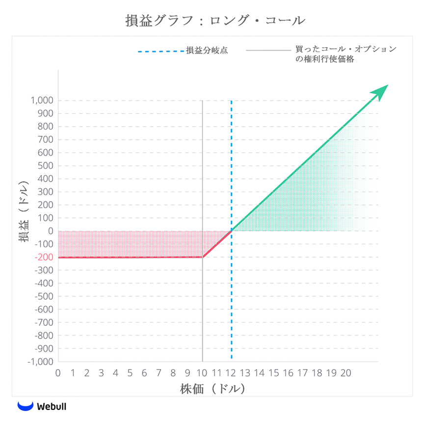 IOIOが12ドルを超えて取引されれば、ロング・コールは利益を生み出します。理論的には、ロング・コールを持つ投資家は、どの価格帯にも達する可能性があるため、思いもよらぬ、利益を得る可能性があります。逆に、潜在的な最大損失は200ドルであり、これは投資家がコール・オプションに支払ったプレミアムです。損益分岐点は、権利行使価格10ドルに支払ったプレミアム2ドルを加えた12ドルです。