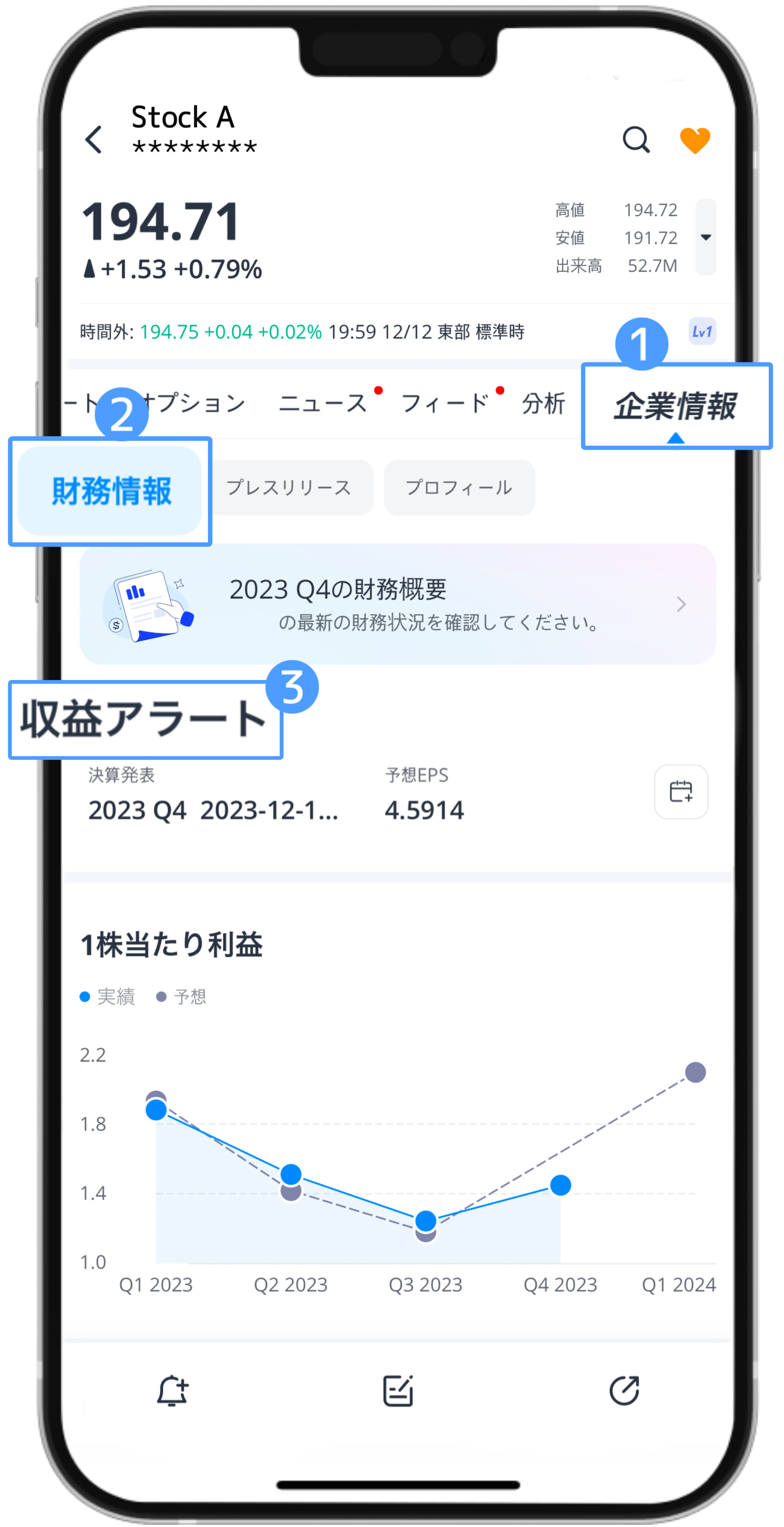 (以下の順にタップしてください:「銘柄詳細ページ」>「企業情報」>「財務情報」>「収益アラート」を表示)。