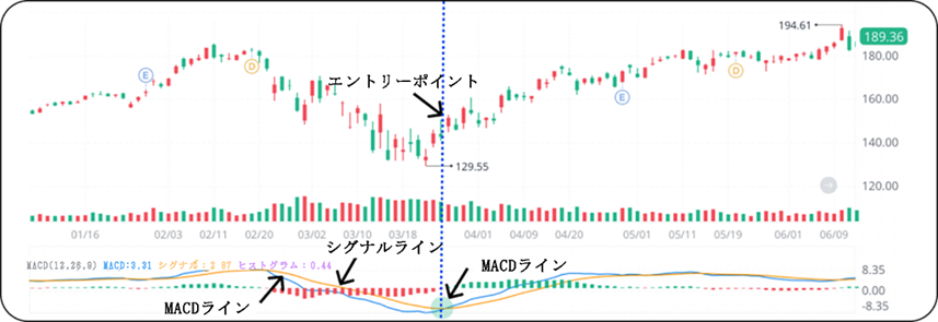 下の例では、株価は1ヵ月の長い下降トレンドの後に上昇しています。その直後、MACDラインがシグナルラインを上回り、強気のクロスオーバーが形成されています。上昇トレンドに移る可能性があると考えられるため、トレーダーはここで買いポジションを持ち、利益を得ようと考えるでしょう。