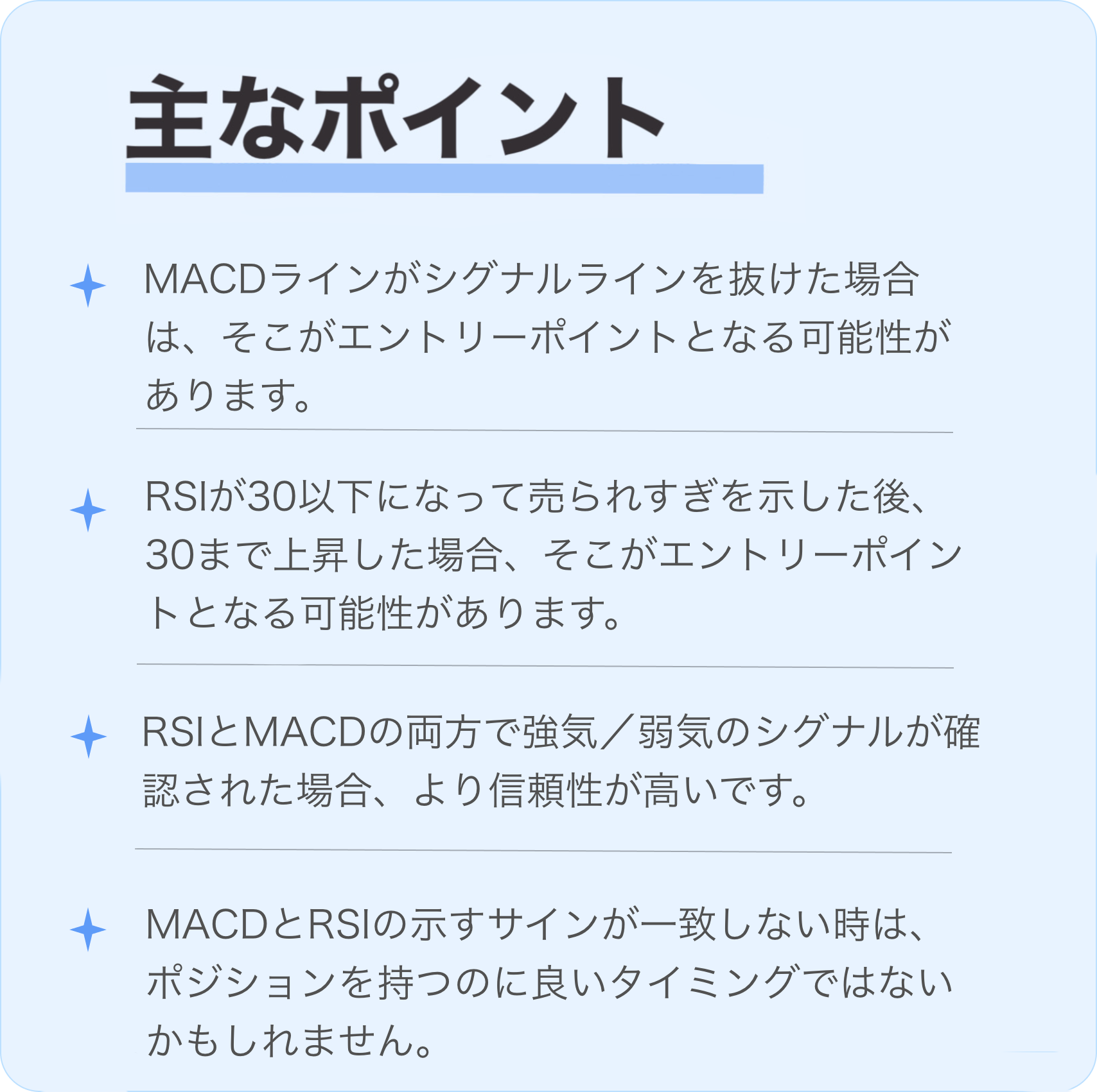 MACDもRSIも、価格の反転やトレンドの勢いを見極めるのに役立ちますが、それぞれ限界があります。