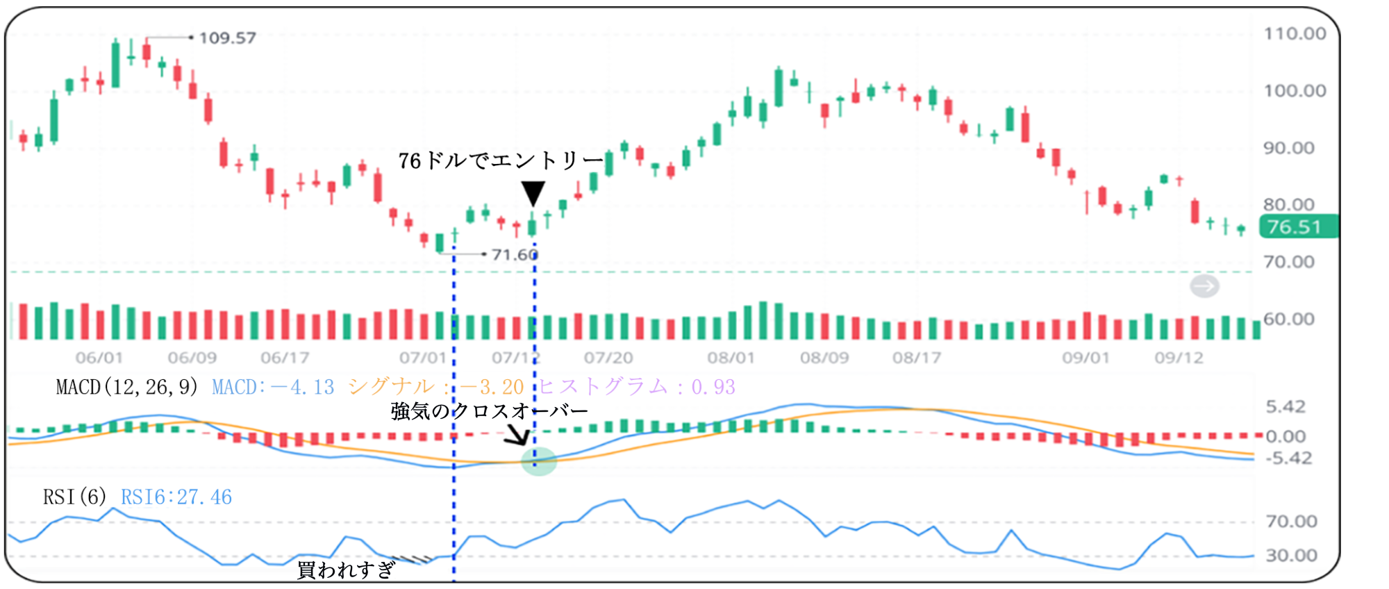 下の例では、下降トレンドのあとにRSIが30を下回り、数日間売られすぎの領域に止まっています。その後、RSIが30を上回ると、強気シグナルが発生します。上昇トレンドが確かなものか見極めたいと思ったスイングトレーダーは、ここからさらにMACDラインがシグナルラインを上回るかどうかを待つ手があるでしょう。