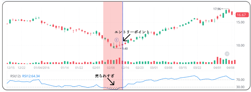下の例では、長い下降トレンドのあと、赤い帯のところでRSIが30を下回っています。RSIは売られすぎの領域に数日間止まり、下げがきついことを示しています。その後、RSIが30まで上昇すると、上昇トレンドに転じる可能性があります。これは通常、売られすぎの時期が終わりつつあることを意味するため、株を買うと良いタイミングである可能性を示しています。