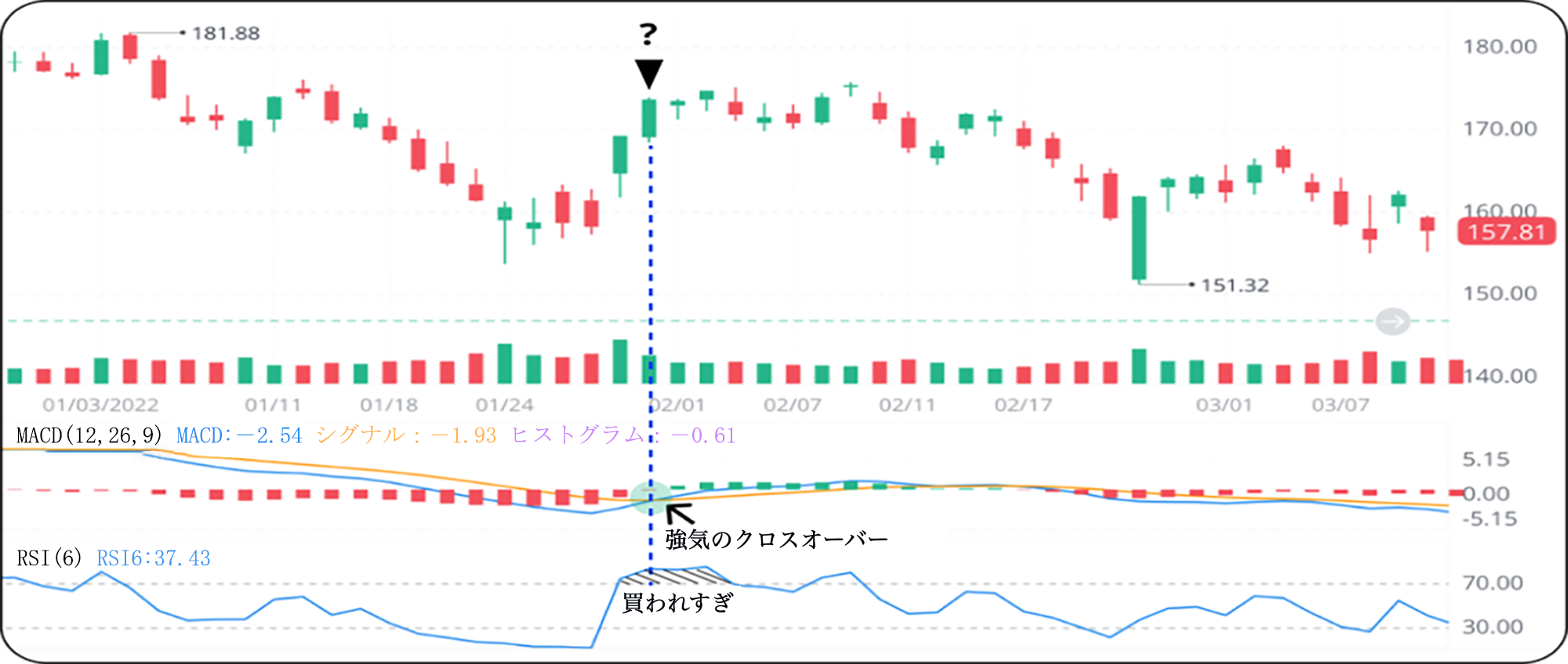 MACDとRSIが示すサインが異なっている時は、ポジションを持つのに良いタイミングではないかもしれません。