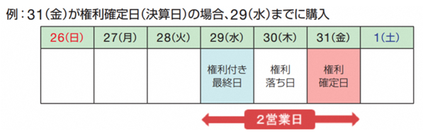 ただし、権利確定日に株式を購入しても、株主としての権利は得られません。株式を購入してから株主名簿に名前が登録されるのに2営業日かかるので、権利確定日の2営業日前(権利確定日を含めて3営業日前)までには株式を購入していることが必要です。なお、権利確定日の2営業日前の日を権利付き最終日と呼びます。
