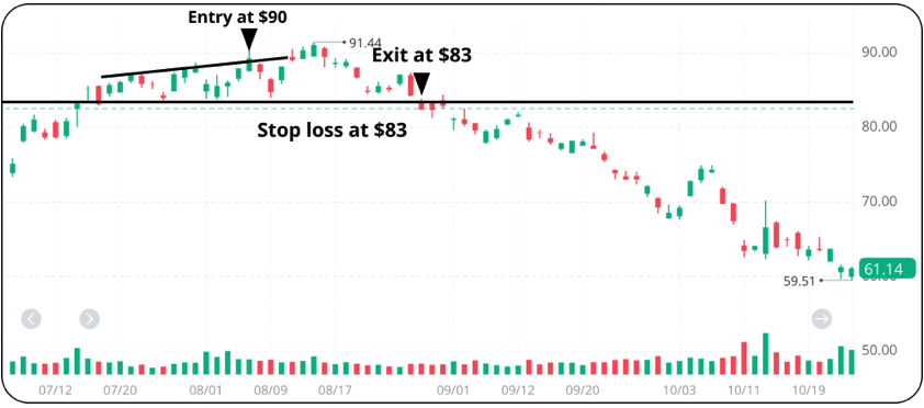 以下の例を見ると、ある投資家は価格が上昇に転じると考え、10株を90ドルで買いました。残念なことに、市場はその投資家が間違っていることを証明し、下落に転じました。その投資家は市場が反発するのをじっと待つのではなく、83ドルでストップ注文を出しました。その投資家のロングポジションは株価がさらに下落する前に解消されました。