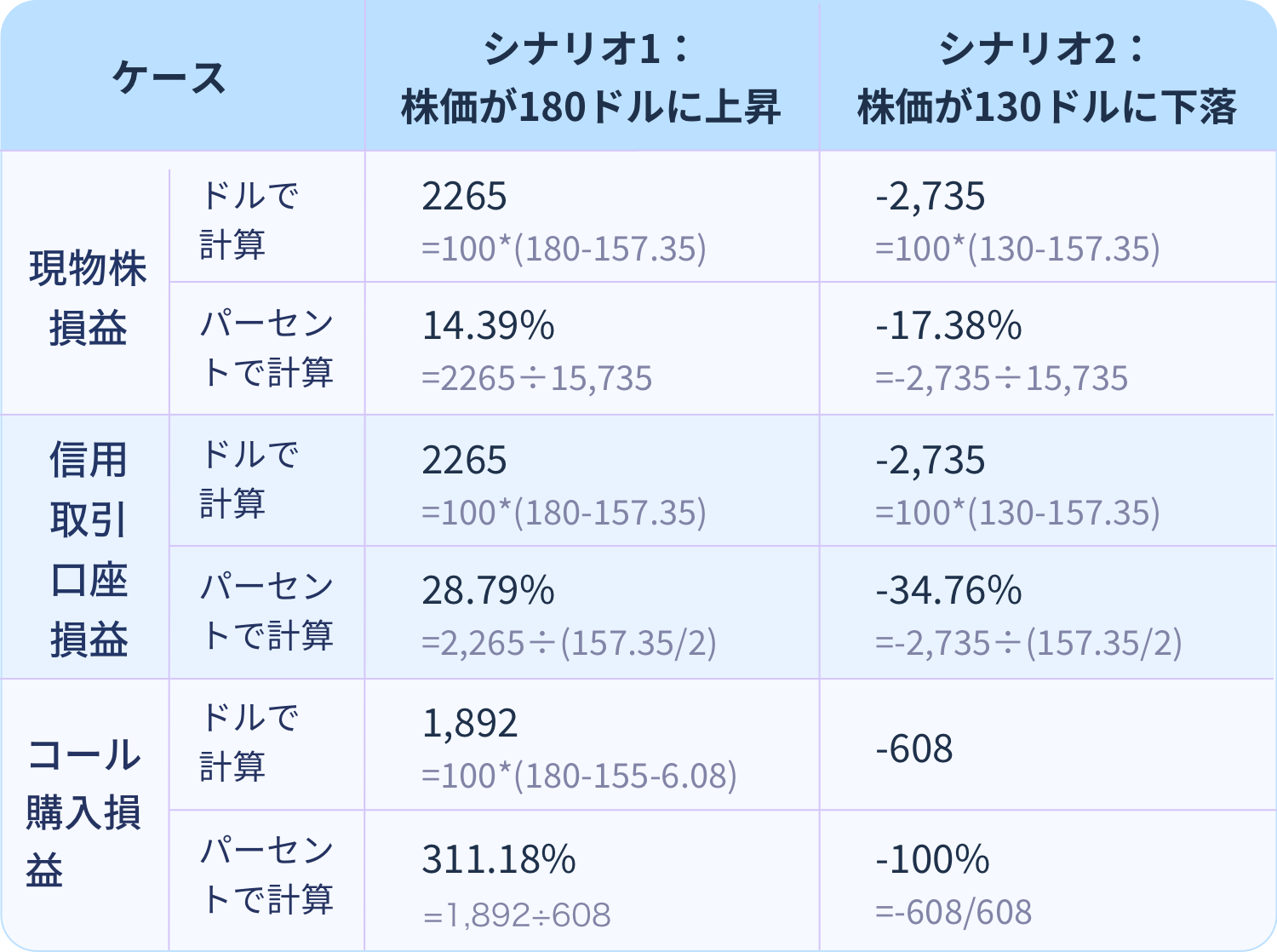 いずれの場合も、保有株の損益計算は難しくありません。また、信用取引口座は取引コストがない場合、原資産価格の動きと比較して、レバレッジのかけ方に応じ、利益と損失が拡大します(上のケースでは2倍)。保証金を利用すると、事前に必要な現金が少なくて済むため、株式をすべて現金で購入するよりも利益率、損失率が高くなります。
