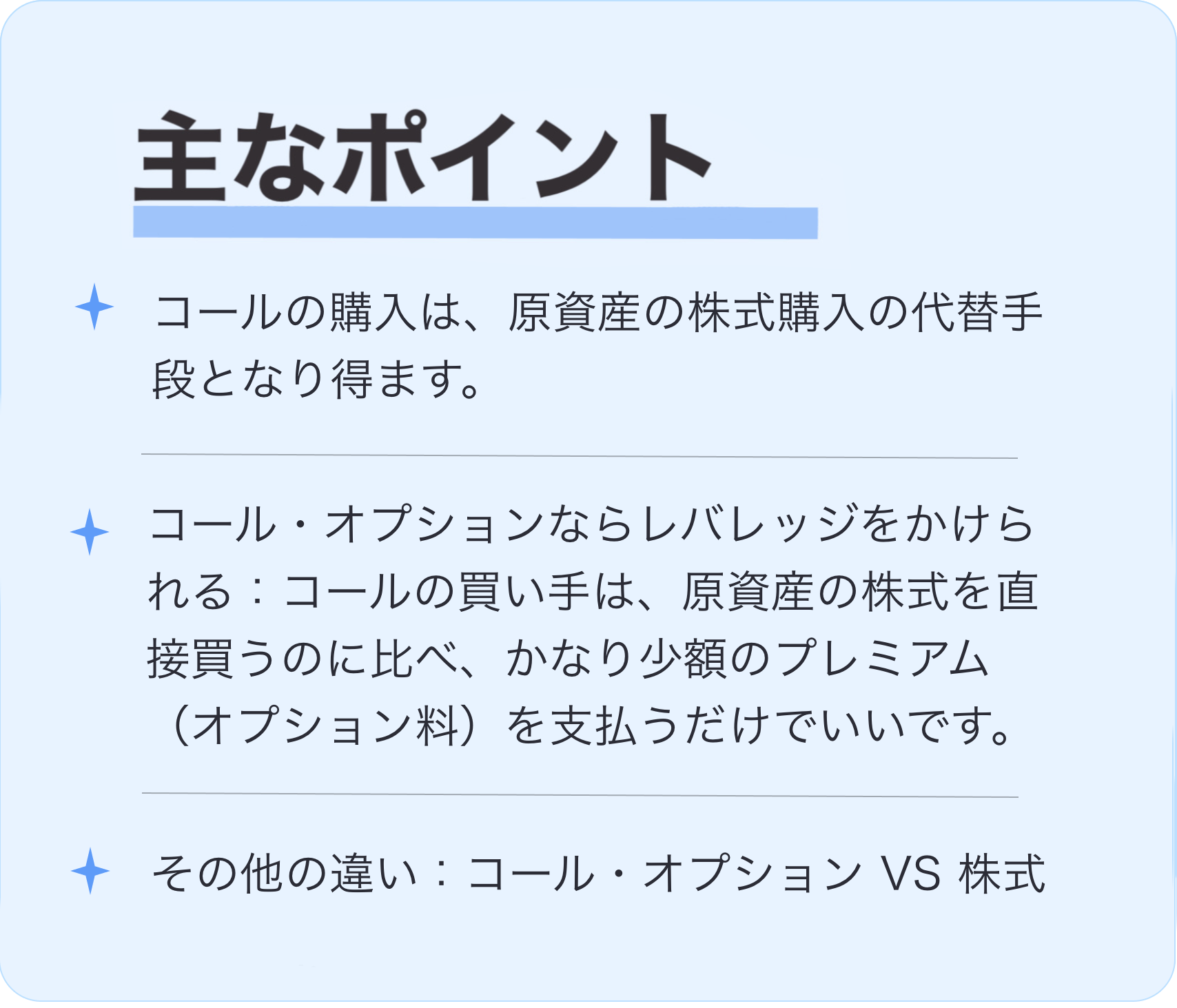 「株式代替戦略」としてコール・オプションを購入することができますが、株式との違いには注意すべきです。