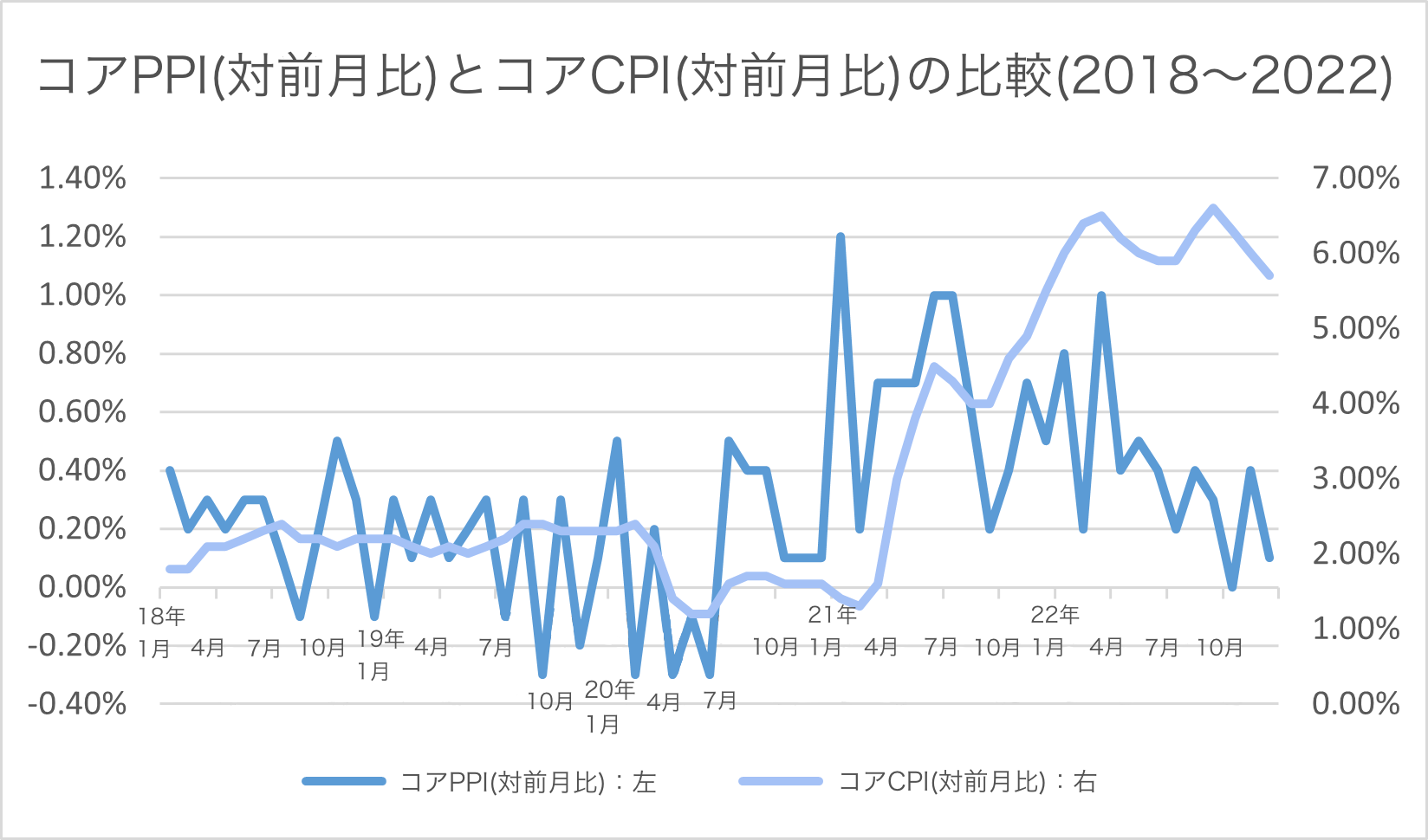 CPI(消費者物価指数)と同様に、PPIもまた卸売段階でインフレを測定するツールとして利用されています。この数値は前月比および前年比の変化で報告されます。例えば、2022年11月のPPIは前月比で0.3%の上昇、対前年比で7.4%の上昇でした。