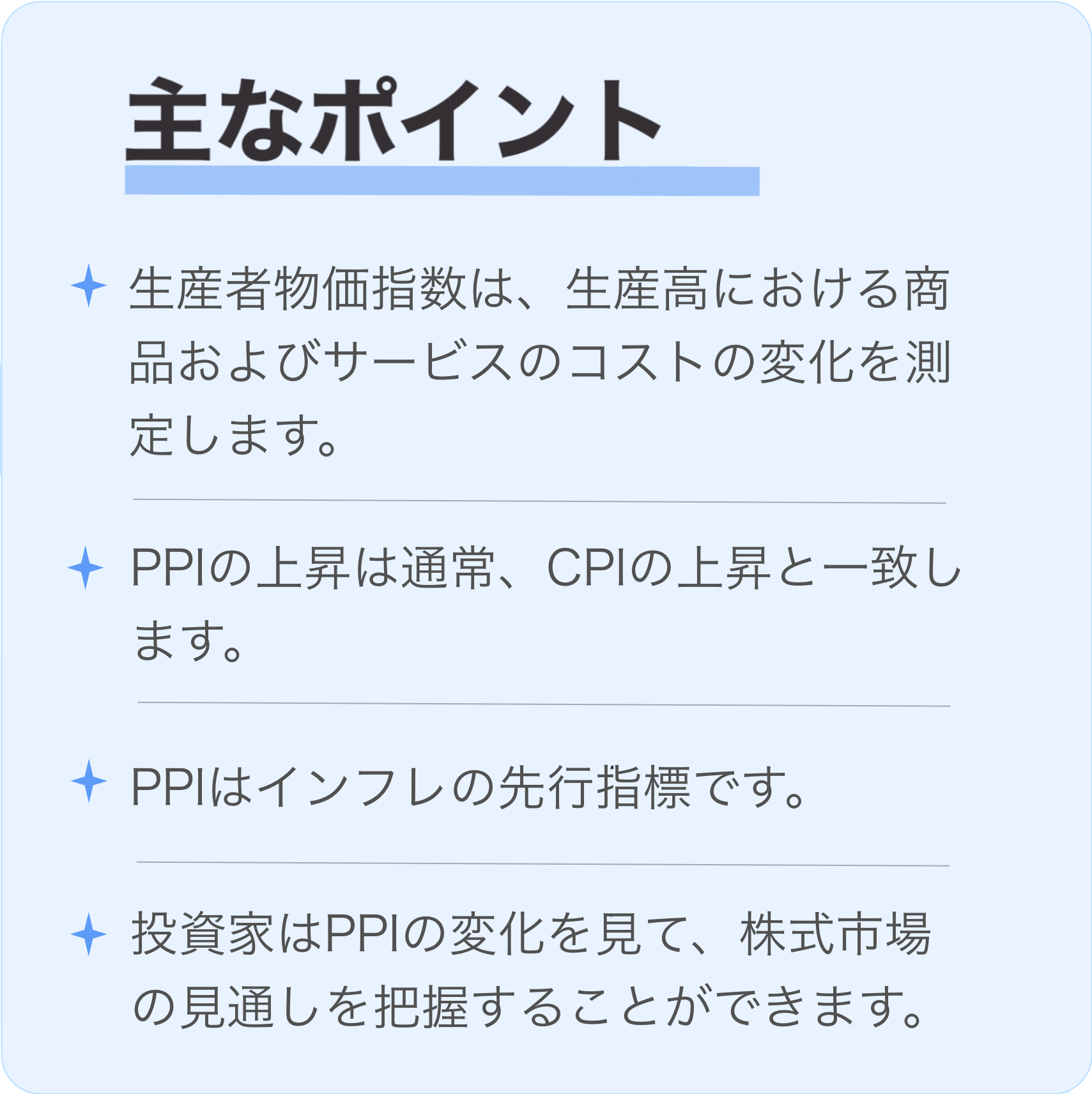 PPIは、CPIおよびインフレ率を予測するために利用できる先行指標です。結果として、金利の変化がすぐに続く可能性があるため、PPIの発表は株式市場の変動を引き起こすことが多いです。PPIの前年比変動は、株式市場の長期的な見通しを示すこともあります。