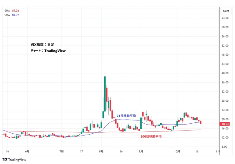 CBOEのVIX指数は、赤線の200日移動平均線 (MA) と青線の21日MAの間まで下げてきています。S&P 500のボラティリティは比較的落ち着いていますが、200日移動平均線を割ってひけるまでは安心できません。