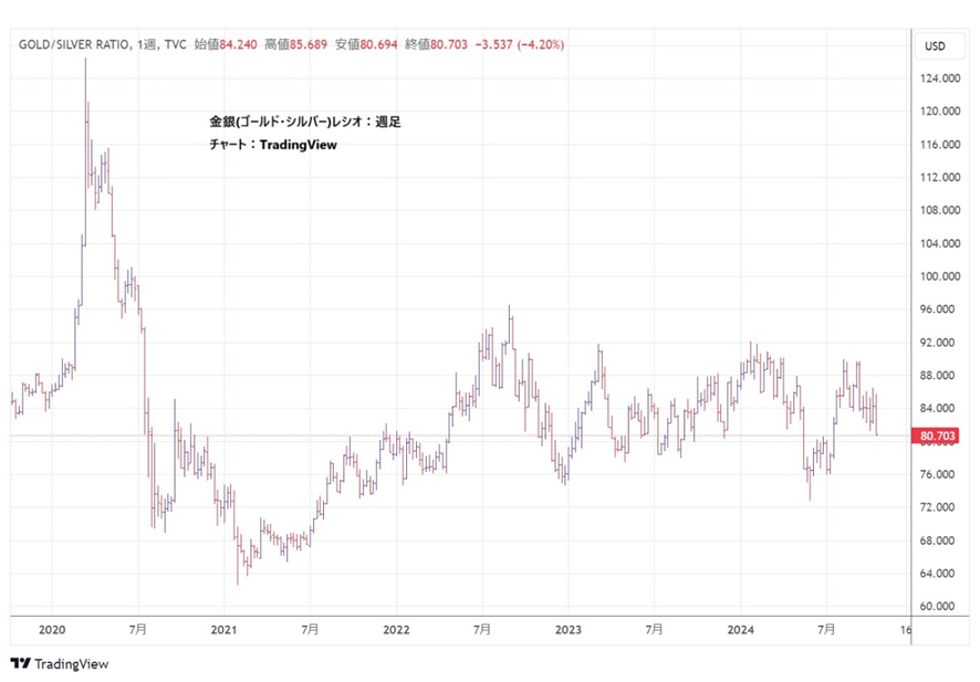 金と銀の相対的な価値を測る金銀比率は約80で、過去2年間の範囲内に収まっていますが、2021年に記録した64よりは高いです。