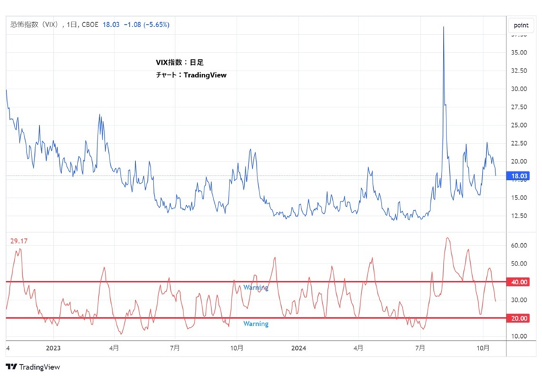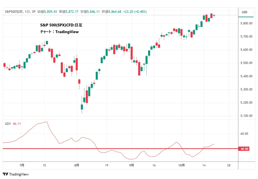ここで注目しているのは、ADXが40を超えたときと20を割ったときです。ADXが40を超えると強いトレンドが発生している可能性が高く、20を下回るとトレンドがなくボラティリティは急低下する傾向があります。10月18日の取引終了時点でADXは29.17と、S&P 500のボラティリティは安定ゾーン内に位置しています。