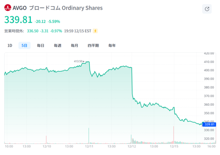 一方で、好決算を発表したにも関わらず、株価調整(下落)しているブロードコム(AVGO)をはじめとして、AI革命の中心的な役割を担うとみられる企業群の株価が軒並み下落しています。