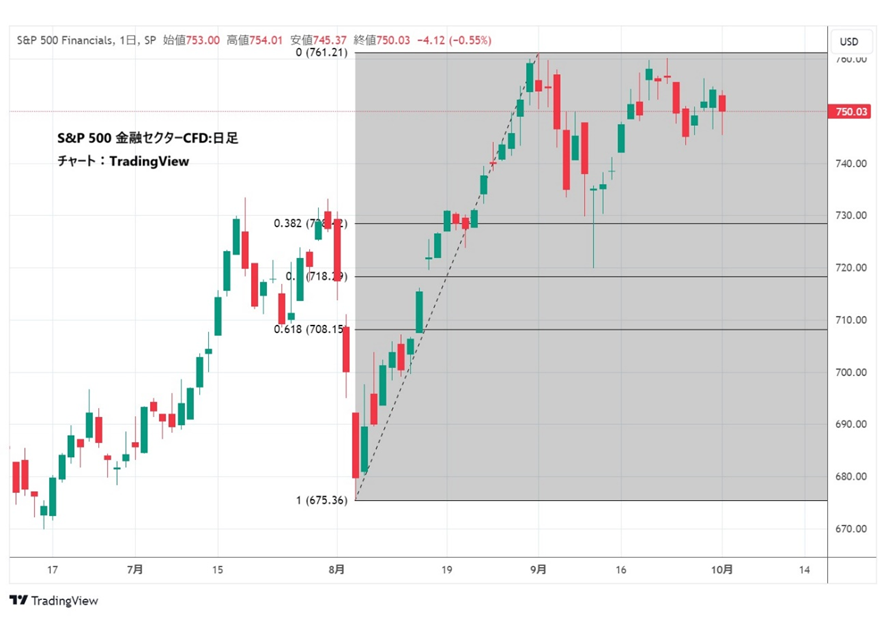 金融セクターは9月に入り、連邦準備制度理事会(FRB)による四年半ぶりの利下げが確実視され、一時、下落していました。しかし、0.5%の利下げを好感して、金融セクターは反発しました。現在、高値圏でもみ合っている金融セクターは一見、とても強くみえますが、MACDのヒストグラムは陰転しています。