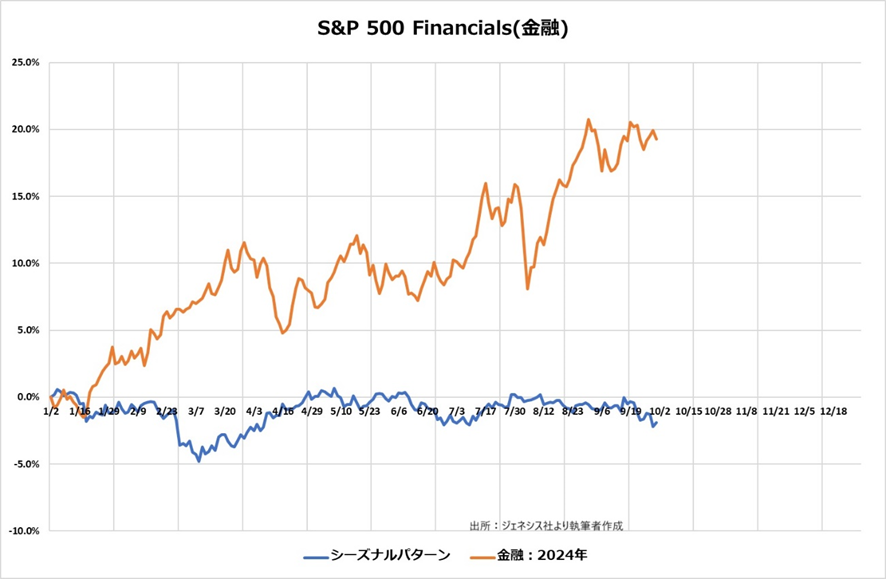 しかし、実際の金融セクターの動きはシーズナルパターン通りではありませんでした。次のチャートで確認してみましょう。