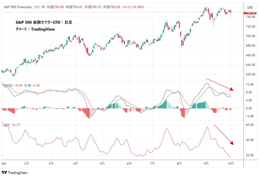 上記のテクニカル分析の結果、金融セクターは近々、調整色を強め、下落してくるとの予想が成り立ちます。今のところ、MACDはプラス圏にあり、上昇トレンドが継続しています。しかし、MACDのヒストグラムの陰転やADXの低下は、上昇モメンタムの減速を示唆しており、注意が必要です。