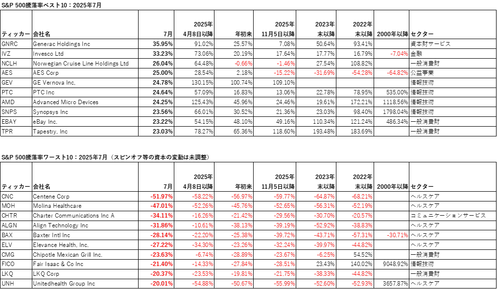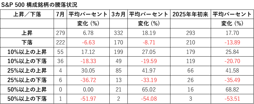 セクター別では、年初来パフォーマンスが最高となったのは資本財サービスで15.26%上昇し、ヘルスケアが5.38%下落して最低となっています。S&P500指数の7月のトータルリターンの2.24%はマグニフィセントセブンを除くと、プラス0.09%になります。また、2025年4月8日の直近安値からのプラス27.72%の大幅なトータルリターンは、これら7銘柄を除くとプラス14.49%となります。ただし、7銘柄の年初来のパフォーマンスは平均するとS&P500指数を下回っています。インデックスの年初来のプラス8.59%のトータルリターンは7銘柄を除いた場合、5.71%となります。