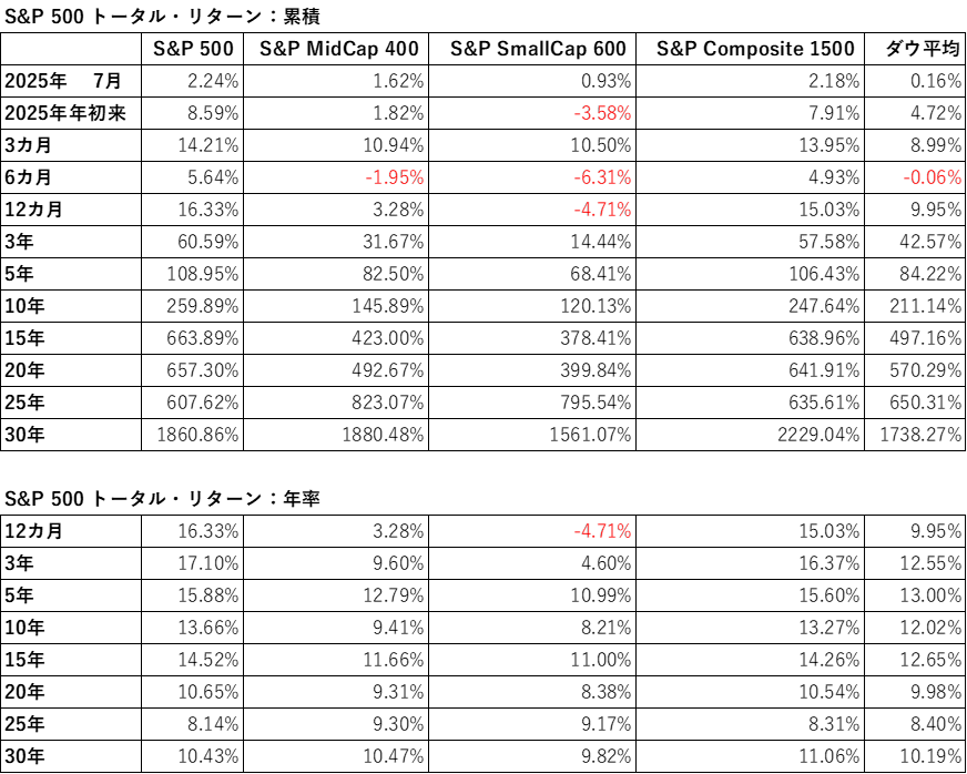 7月に、ボラテイリティが低下する中で、S&P500指数は2.17%上昇しました(配当込みのトータルリターンはプラス2.24%)。6月は4.96%の力強い上昇(同プラス5.09%)5月は6.15%上昇(同プラス6.29%)、4月は0.76%下落(同マイナス0.68%)、3月は全面安の展開で5.75%下落(同マイナス5.63%)、2月は1.42%下落(同マイナス1.30%)、1月は2.70%の上昇でした(同プラス2.78%)。S&P500指数は過去3カ月間に13.83%上昇しました(同プラス14.21%)。年初来では7.78%上昇(同プラス8.59%)、7月までの過去12カ月間では14.80%上昇しています(同プラス16.33%)。2024年通年では23.31%上昇(同プラス25.02%)、2023年は24.23%上昇(同プラス26.29%)、2022年は19.44%下落(同マイナス18.11%)でした。より長期で見ると、S&P500指数は過去3年、5年、10年の期間でそれぞれ53.49%、93.80%、201.33%上昇しており、配当込みの年率トータルリターンはそれぞれプラス17.10%、プラス15.88%、プラス13.66%となっています(3つの数値とも本レポートで報告されているインデックスの中で最高)。