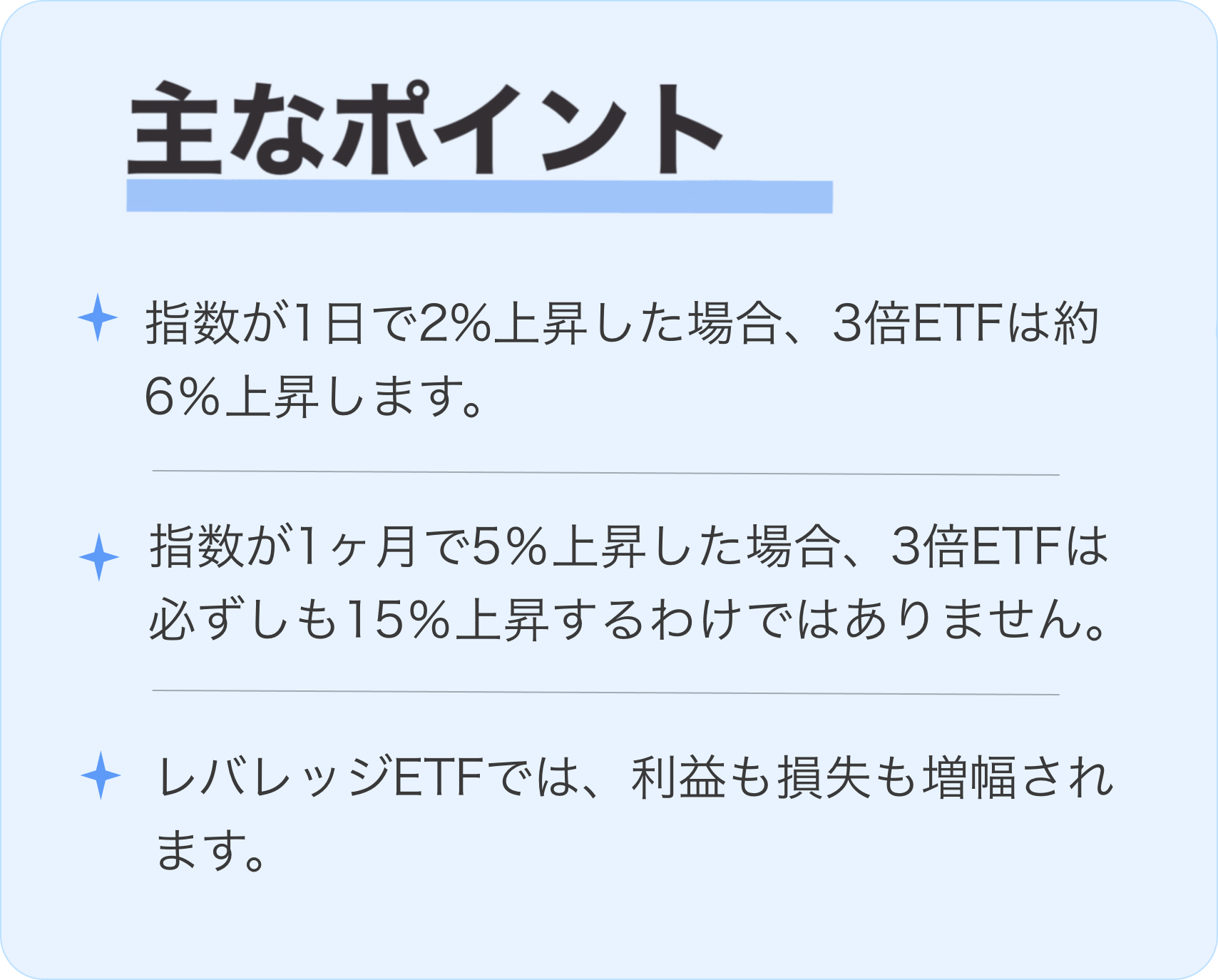 レバレッジ型ETFの場合はそうではありません。株価指数が1日で1%上昇した場合、レバレッジ3倍のレバレッジ型ETFは約3%上昇すると予想できます。しかし、株価指数が1週間で2%上昇した場合は、3倍のリターンを求めるレバレッジ型ETFが6%上昇するとは限りません。