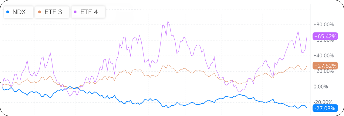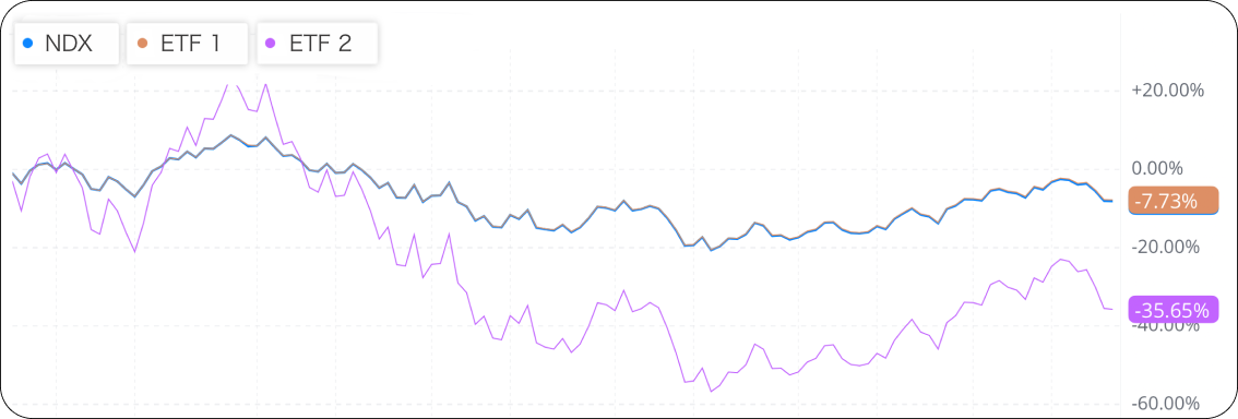 一方、ETF 2の6ヵ月間の下落率は約35%で、NDX の下落率のほぼ5 倍になります。