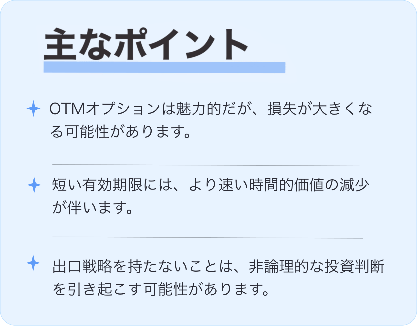 アウト・オブ・ザ・マネー(OTM)のオプションは、アット・ザ・マネー(ATM)やイン・ザ・マネー(ITM)のオプションよりも低コストなので、初心者の方にとっては魅力的かもしれません。安く買って高く売るという戦略に従おうとしている場合、OTMオプションのコストが低いということは理想的に見えます。