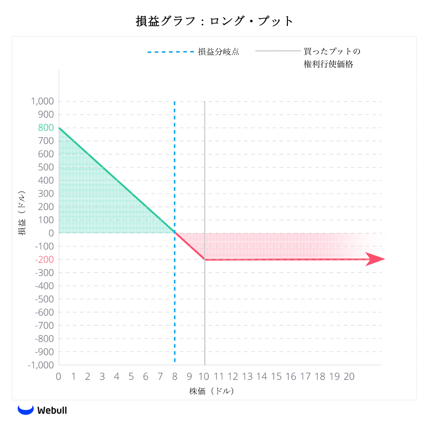 EIOの取引が8ドル以上のままであれば、投資家は0ドルから200ドルの間で損失を被ることになります。EIOの株価が8ドルを下回ると、「プットの買い(ロング・プット)戦略」は利益を上げ、価格がゼロになれば最大800ドルの利益を得る可能性があります。損益分岐点は8ドルで、これは権利行使価格10ドルから支払ったプレミアム2ドルを差し引いた額です。