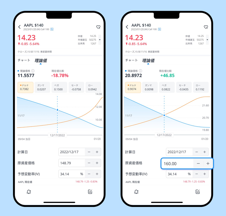 権利行使価格160ドルのアウト・オブ・ザ・マネーのコールの代わりに、今度は2023年1月23日満期、権利行使価格140ドルのAAPLのイン・ザ・マネーのコールを詳しく見てみましょう。