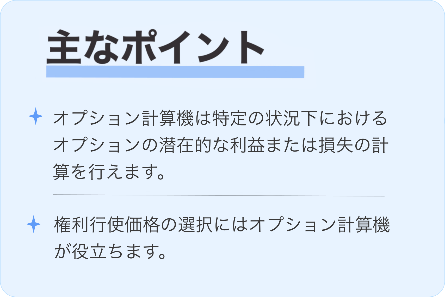 オプション価格計算ツールを使えば、特定のオプションの理論値を計算することができます。オプション取引では、投資について十分な情報に基づいた意思決定を行うために、様々なツールを使用することが重要となってきます。