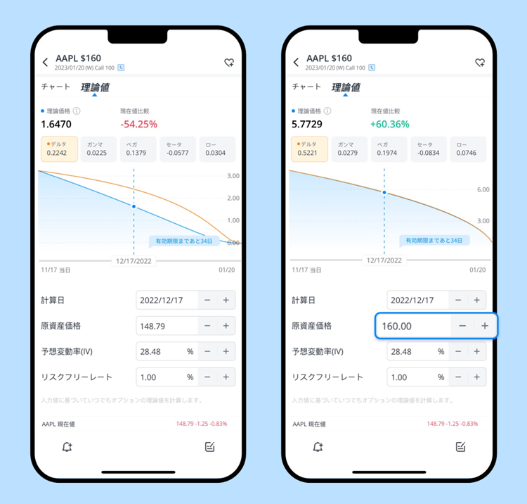 これらのデータをオプション計算機に入力すると、このイン・ザ・マネーのコールは、AAPL の株価が現在の水準にとどまった場合は先ほどより損失が小さくなり(-18.78%)、一定のボラティリティ環境下で株価が 30 日後に160ドルまで上昇した場合は利益が小さくなる(+46.85%)ことが分かります。