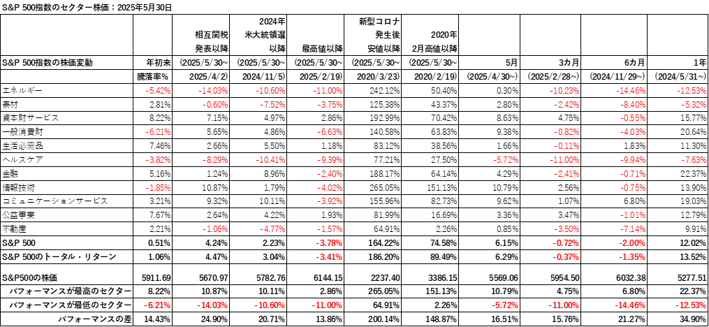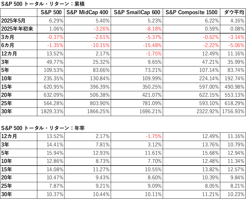 出所:S&Pダウ・ジョーンズ・インデックス 2025年5月末現在。表は図示する目的のためだけのものです。過去の運用実績は将来の運用成果を保証するものではありません。