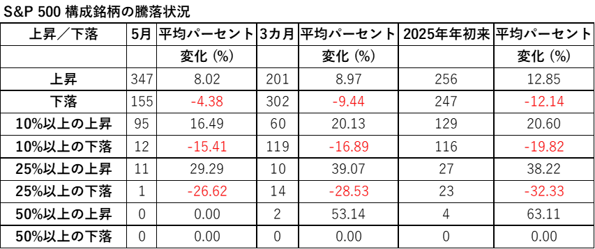 また、5月は値上がり銘柄数が増加し、347銘柄が値上がり、155銘柄が値下がりしました。4月は値上がり銘柄数が168銘柄、値下がり銘柄数が331銘柄、3月は値上がり銘柄数が154銘柄、値下がり銘柄数が349銘柄、2月は値上がり銘柄数が248銘柄、値下がり銘柄数が255銘柄、1月は値上がり銘柄数が355銘柄、値下がり銘柄数が148銘柄でした。