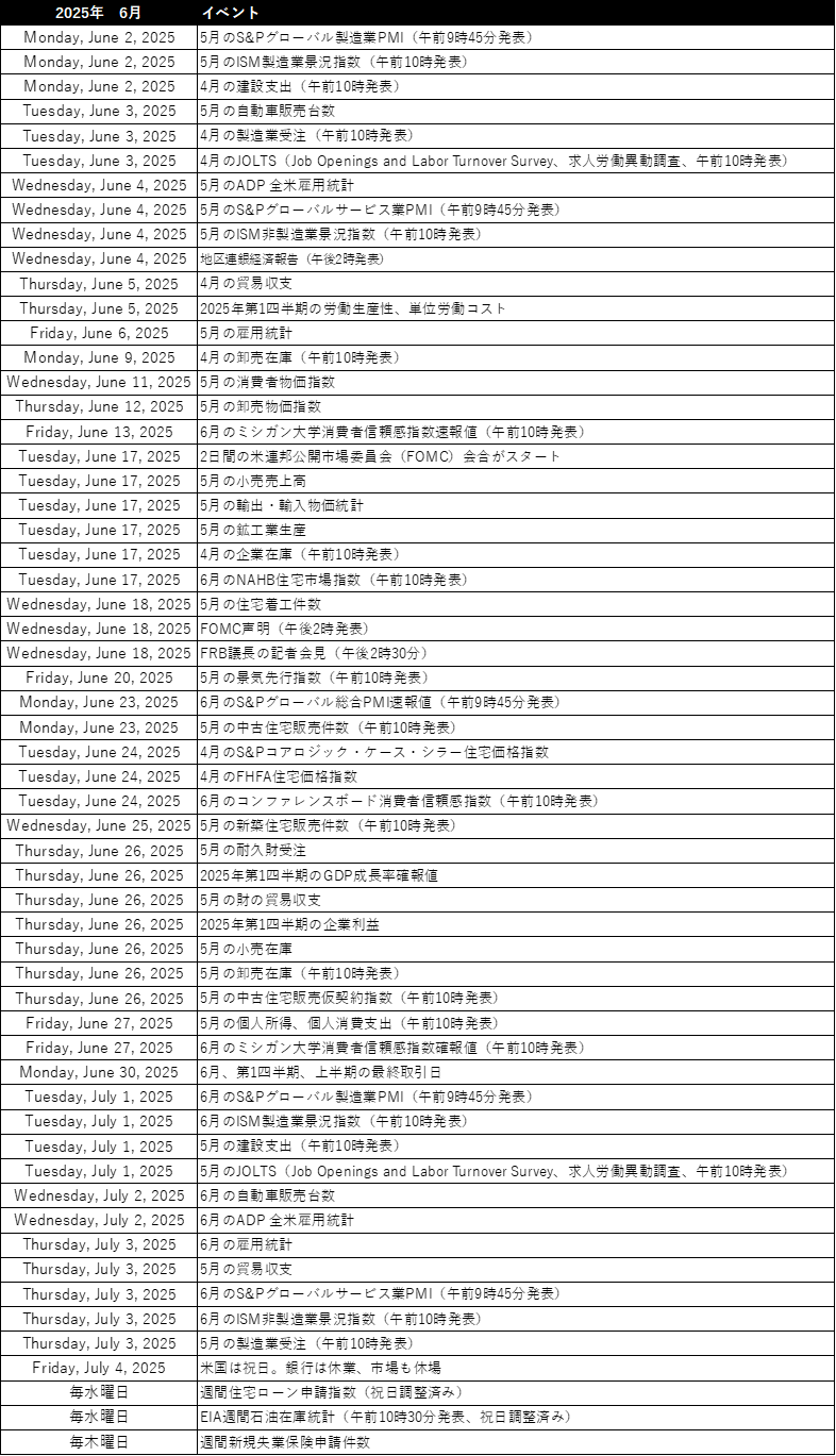 6月も関税問題(とそれに関連する司法判断)が引き続き重大な懸念材料となることが予想されますが、議会は大型の税制・歳出法案の可決を目指しています。主要な経済指標が相場の方向性を決定付けるのに一役買うことになりそうです。6月6日発表の雇用統計(ADP全米雇用統計の発表は4日)、11日の消費者物価指数(CPI)、翌12日の生産者物価指数(PPI)、さらに17-18日に予定されている米連邦公開市場委員会(FOMC、政策金利は据え置かれる見通し)が注目材料です。