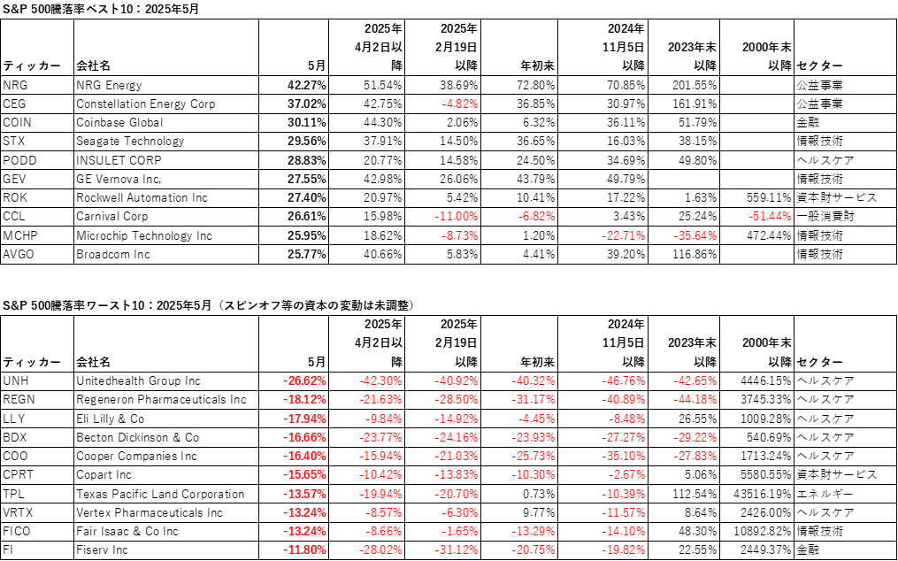 S&P500指数は5月に6.15%上昇しました(配当込みのトータルリターンはプラス6.29%)。4月は0.76%下落(同マイナス0.68%)、3月は5.75%と大幅下落(同マイナス5.63%)、2月は1.42%下落(同マイナス1.30%)、1月は全面高となり2.70%上昇(同プラス2.78%)でした。過去3カ月のリターンは依然としてマイナスで0.72%下落(同マイナス0.37%)、年初来では0.51%上昇(同プラス1.06%)、過去1年では12.02%上昇(同プラス13.52%)となりました。2024年は23.31%の上昇でした(同プラス25.02%)。