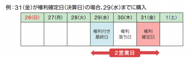 なお、権利確定日の「2営業日前」が期限のため、もし31日が月曜日であれば27日(木)が権利付き最終日となる点に注意しましょう。