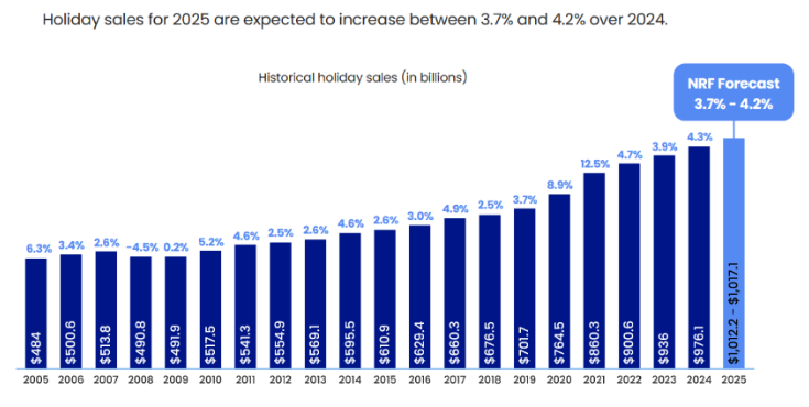 アメリカのGDPは消費が7割程度をしめるということで、特に重要視される感謝祭からクリスマスまでのホリデー商戦。全米小売業協会では、今年の見通しについて以下のように推計しています。