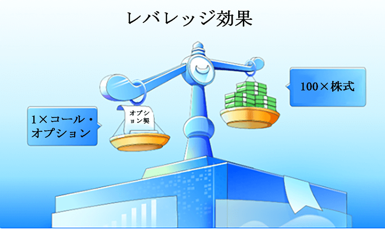 オプションの買い手は、契約金額(通常はオプションの原資産となる株式100株分)に対して比較的小さなプレミアム(オプション料)を支払うだけで、株式を売買したのと同じような効果を得ることができます。投資家は、原資産となる株式の比較的小さいけれど有利な価格動向から、大きな利益を得ることができます。