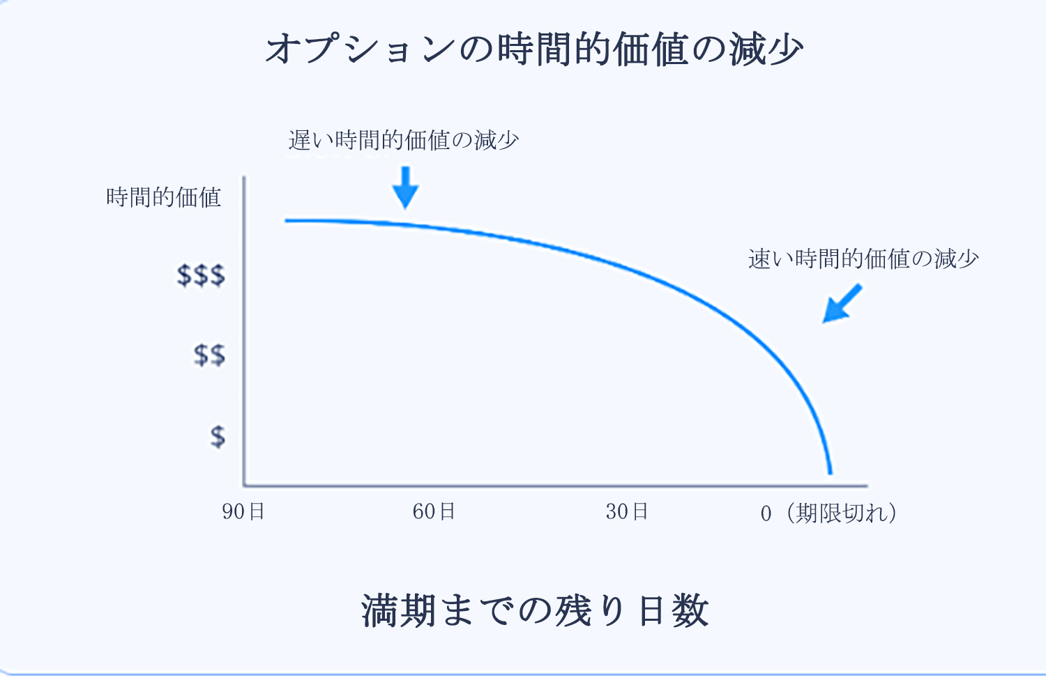 また、オプションは減価する資産であり、その時間的価値は、満期に近づくにつれて減少します。この変化は「時間的価値の減少(タイム・ディケイ)」と呼ばれます。タイム・ディケイは、オプションの買い手に不利に働き、オプションの売り手に有利に働きます。