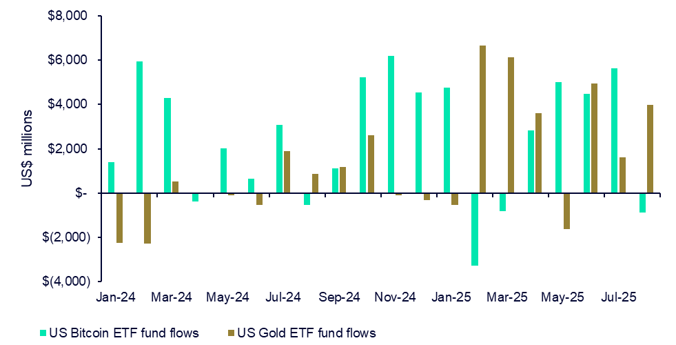 · 米国で上場するビットコインETFと金ETFは、ドルのヘッジ取引および代替資産に対する需要が拡大するなか、いずれも2025年に購入活動がネットベースで高まっています。しかし8月には、スポット金のフロー(流入)とスポット・ビットコインのフロー(流出)の月間の乖離(かいり)が2025年3月以降で最大となりました。8月の米国の主要な金ETFが40億ドルの流入超となったのに対して、主要ビットコインETFは9億ドルの流出超となりました4。