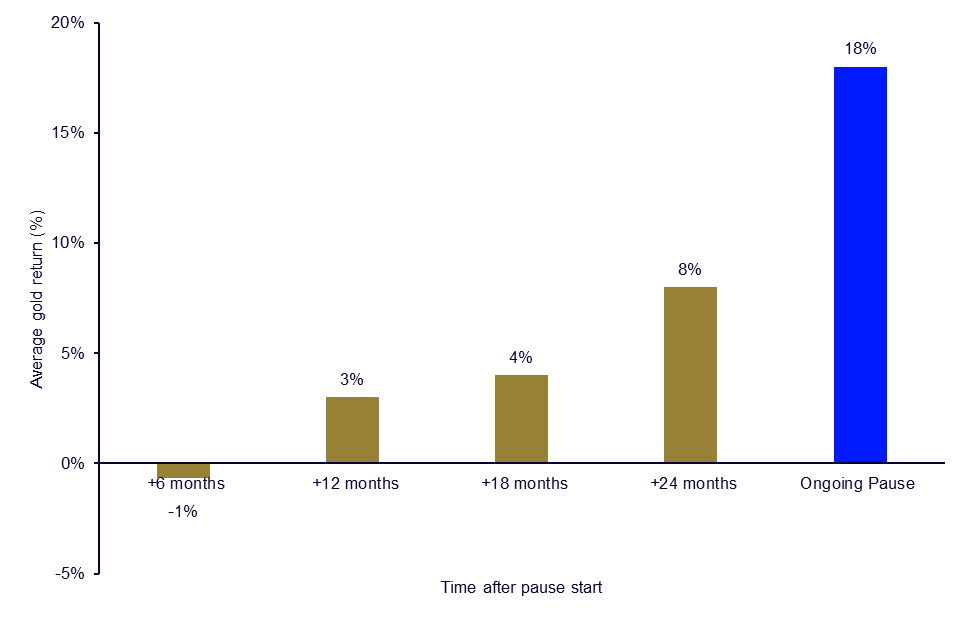 · 現在の利下げ停止期間中に金のリターンは、ETFへの資金流入の再開、隠れた市場リスク、更なる金融緩和観測を背景にすでに+18%と6、当社モデルが宣言した公式停止日から6カ月間のリターンの過去平均を大きく上回っています。