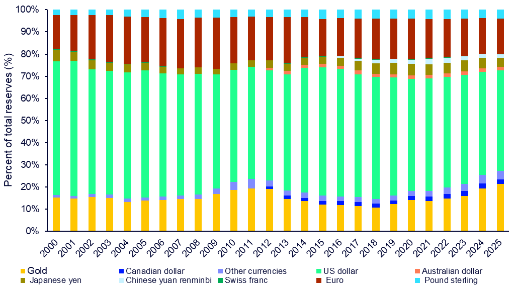 出所:国際通貨基金(IMF)、ワールド ゴールド カウンシル、ステート・ストリート・インベスト・マネジメント 2025年3月31日時点