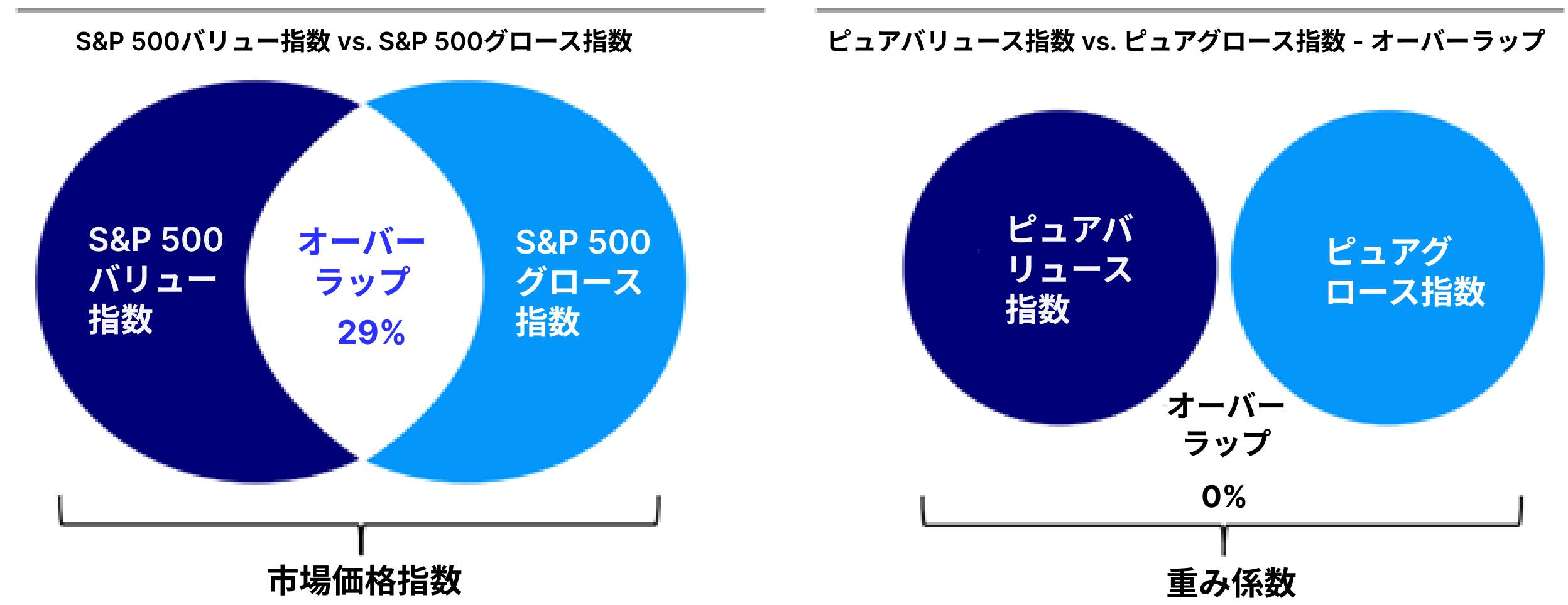 ファクターETF戦略を実行する際は、そのETFがどのように構築されているかを確実に理解することが重要です。例えば、バリューとグロースは逆相関のファクターであり、バリューが値上がりすればグロースは値下がりし、その逆もまた然りである。あるETFはバリューETFかもしれないが、グロースETFで採用されている銘柄と重複している場合もあります。特定のETF発行会社は、バリューETFがグロースETFと重複しないようにETFを構築するピュア・ファクターのアプローチをとり、より純粋なファクター・エクスポージャーを提供しています。