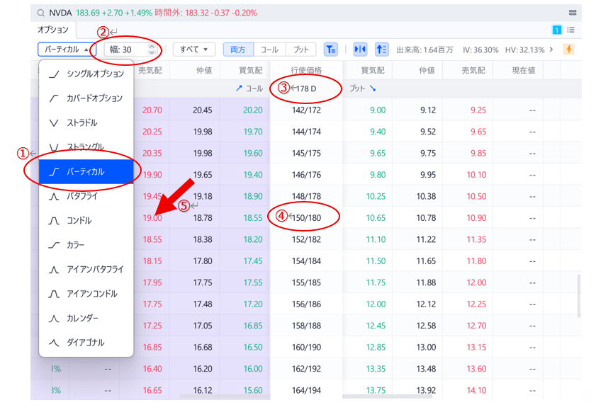 さて、前編で取り上げたC150とC180のブルコールスプレッドは、権利行使価格の幅が30であるから「幅30」を選択し(②)、満期を選んで(③)、あとは150と180の組み合わせを探し(④)、売り気配をクリックする(⑤)。