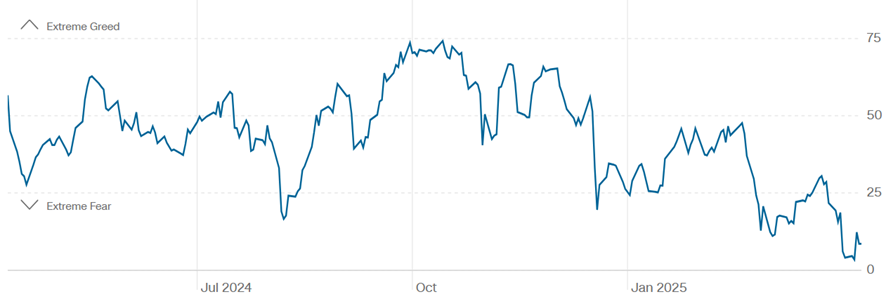 まず、CNNが発表する恐怖貪欲指数は、4月8日に3まで低下。歴史的に見て、この水準で長くとどまっていたことはありません。