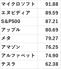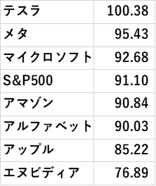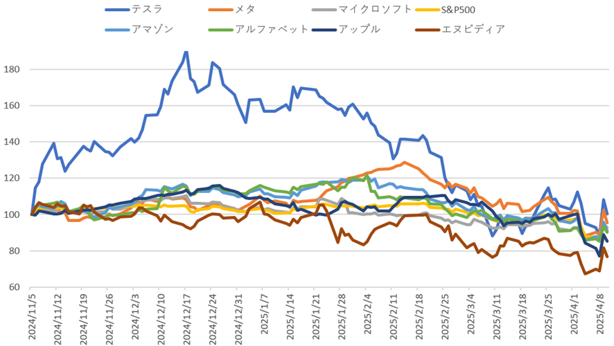 実際、トランプ2.0の誕生が見えた、昨年11月5日の株価を100としたときの直近価格は以下のとおりで、1月末からの株価下落幅の大きいテスラも、11月5日来では、横ばいと言えます。