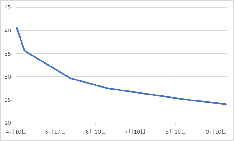 次に、S&P500の変動幅を示すVIX指数について、先物市場が織り込んでいる将来の値は、以下のとおり。