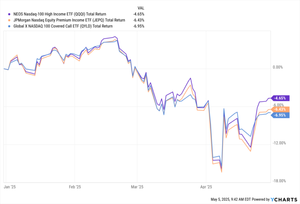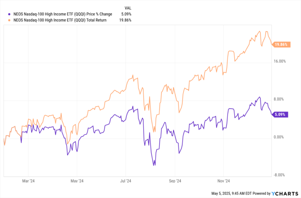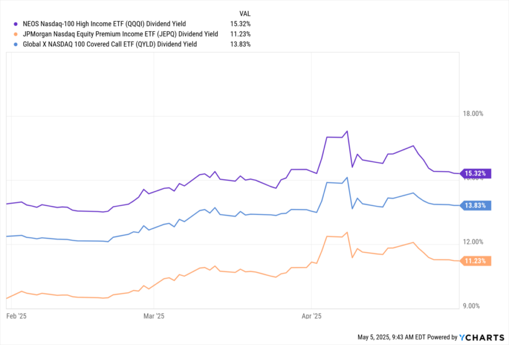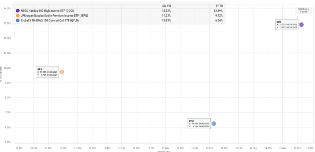 5月5日にこれを書いている時点でのQQQIの1年間のパフォーマンスは、トレーリング利回りが最も高く、トータルリターンも最高であるため、これも以下にも反映されています。