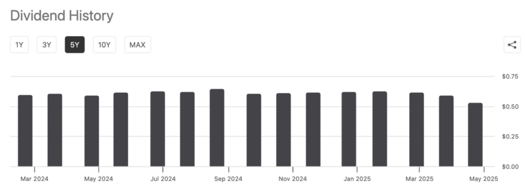 以下からわかるように、この税効果の高い月次収益の規模は非常に安定しており、投資家に支払われる1株あたり約0.62ドルです。