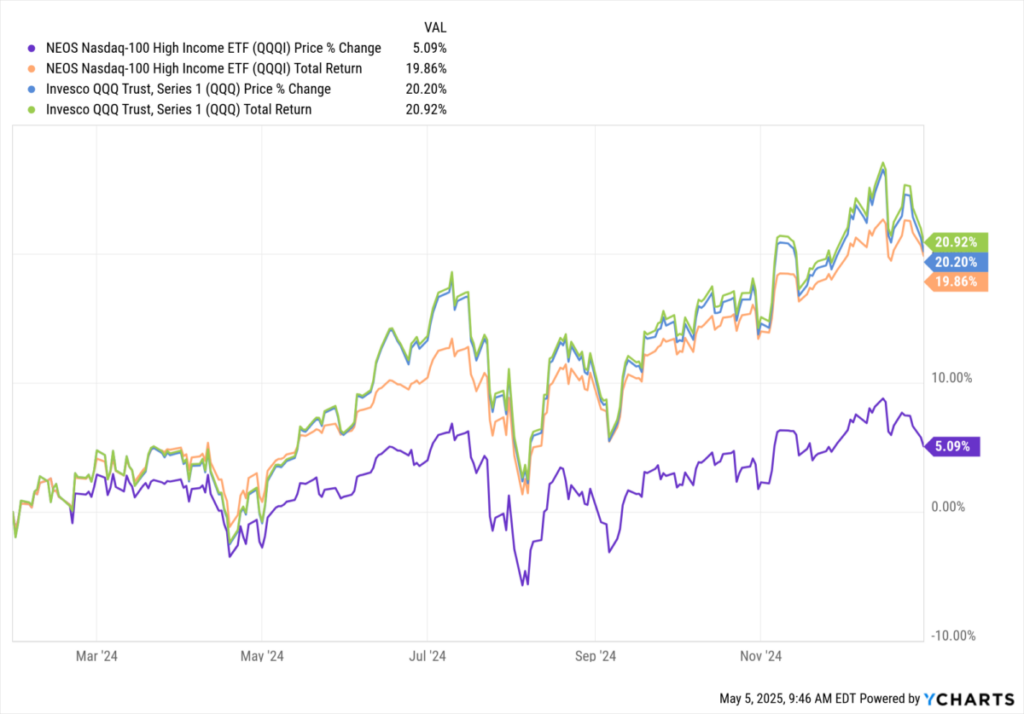 興味深いことに、QQQIが追跡する原資産指数のトータルリターンと比較すると、設立以来のトータルリターンは当然のことです。